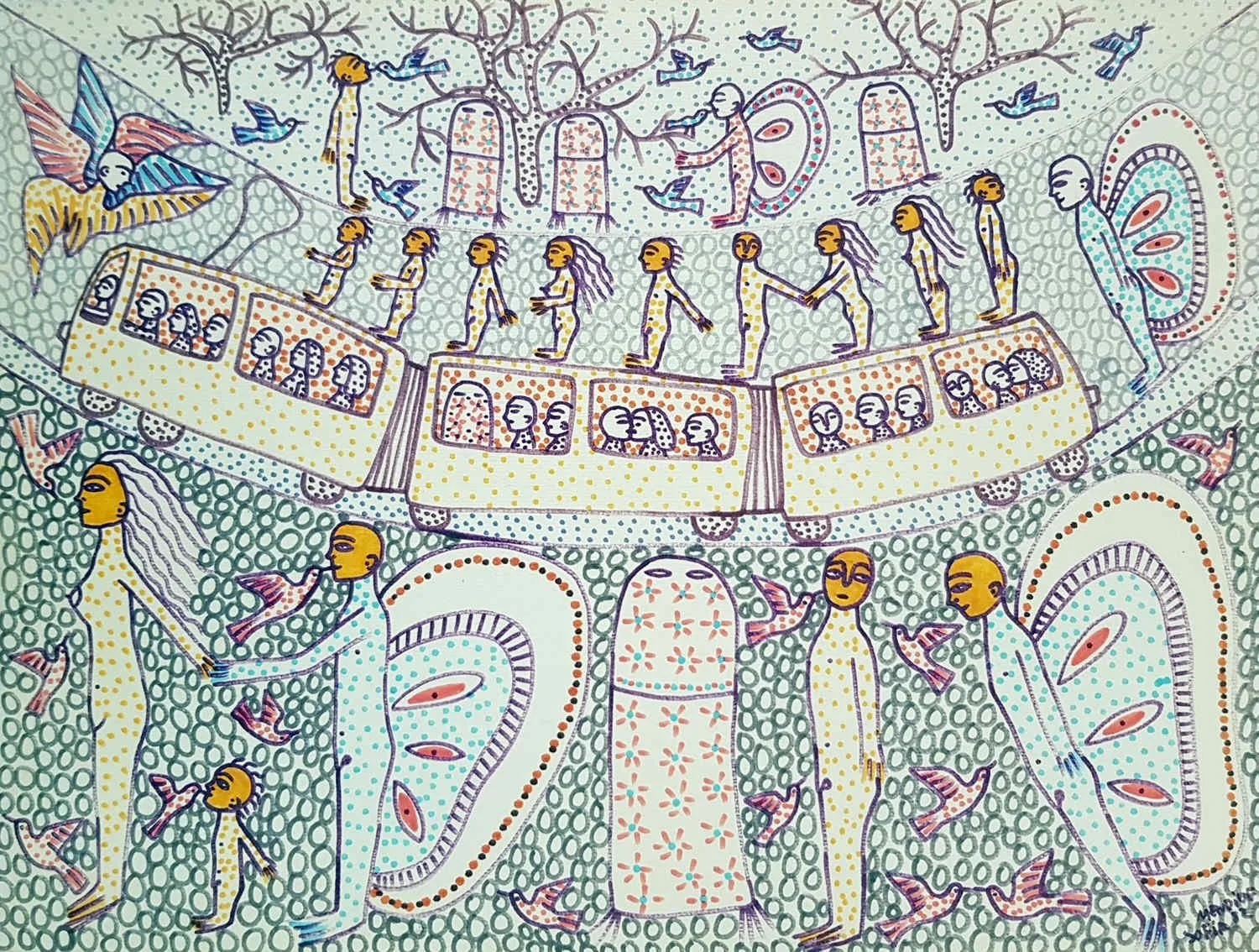 Angels by Manuel Mendive. An essential piece by Afro-Cuban artist Manuel Mendive, executed during his travels to Europe in 1982, illustrates his visions of the passage between life and death. Mendive was born in Havana, Cuba, in 1944. His family practiced La Regla de Ocha, or Santería. A mulatto, he cherishes his Yoruba roots from the West Coast of Africa.[1] In 1963, he graduated from the San Alejandro Academy of Plastic Arts, Havana. Size (h w d): 14 x 18 in. Medium: pen and ink on paper. Creation Date: 1982